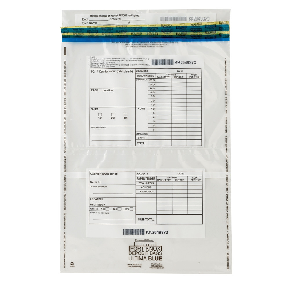 - Both top and bottom bags are coded with a matching bar code, tear-off receipt matches for an easy-to-follow audit trail
